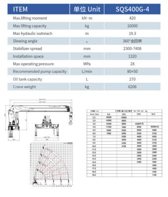 With its extended 19.3 m hydraulic outreach, reinforced boom system, and reliable 360° slewing mechanism, the SQS400G-4 is engineered to handle demanding job sites where strength, reach, and efficiency are essential.