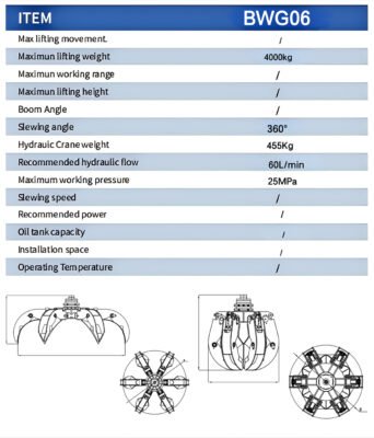 Engineered for forestry, scrap recycling, construction, and industrial material transfer, the BWG06 delivers powerful lifting performance combined with smooth, precise hydraulic control. Its robust structure and optimized hydraulic system make it suitable for stationary installations, truck mounting, and marine platforms.