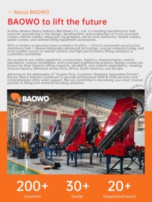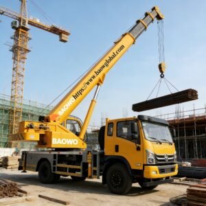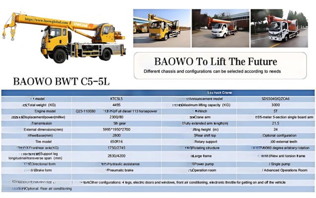 BAOWO BWT C5-5L is a 3-ton truck crane with 24m lift height, 5-section boom and compact chassis. Ideal for urban construction and material handling. Factory price available.